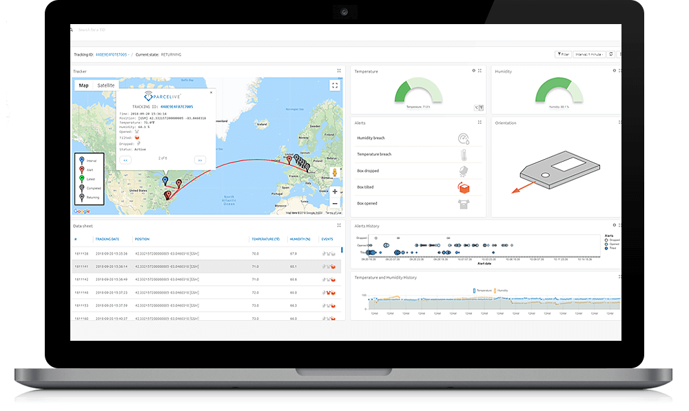 As well as orientation ParceLive offers a host of other data including GPS location, temperature & humidity as well as information on whether a box has been dropped or opened.