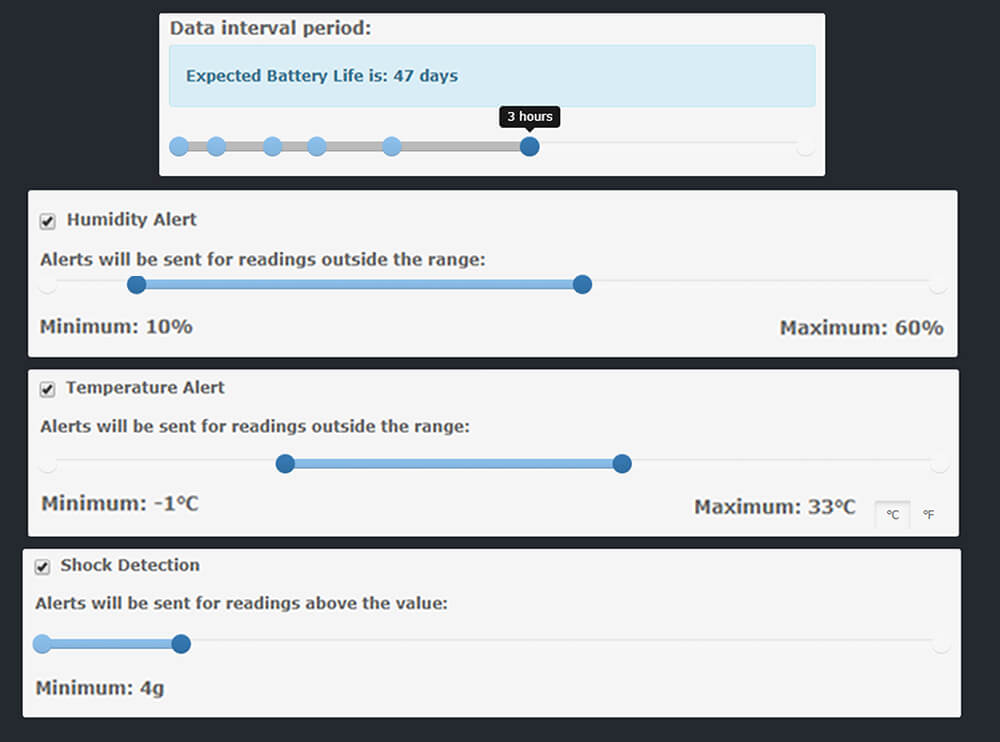 Users will be able to set the interval rate (the rate at which data is sent back from ParceLive trackers), as well as thresholds for temperature and humidity. Similarly, alerts for ParceLive’s tilt, light and freefall features can be turned on or off depending on the relevance of the data to that particular shipment.