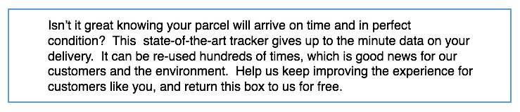 Be it the latest blockbuster, a widget for something DIY important or a case of wine, we all know the feeling of waiting for parcels to arrive. Then they do. We tear them open, sift through for our stuff, and then chuck the packaging in the re-cycling. Or re-seal it ready for a return. Apart from what we’ve bought, there’s nothing else in there of worth that needs our attention. Only you, committed to our customer experience, have included a Parcelive tracker. We weren’t expecting it, we’re not primed to look for it, let alone do something with it. How do can we be nudged into action?