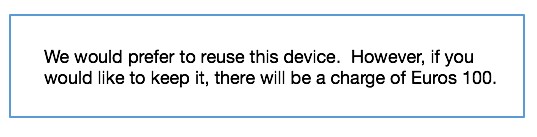 These devices are valuable, so it is tempting to do so. The “Deterrence Hypothesis” suggests that a fine would work. However, it can backfire in several ways. Consumers may comply to avoid a penalty, or avoid a brand that threatens penalties. Then there is our sense of fairness (Justice Theory), and our need to have a level of control over the penalty situation. If we know how we can avoid the penalty, have the appropriate warning, and the amount seems to reflect the action, we are more accepting (17). There is, however, a risk that a fine becomes a price, as illustrated by the tests done with parents picking up their kids from daycare. The number of parents being late, and the amount of time by which they were late, increased with the implementation of the fine system. Indeed, even after the fine was removed, the behaviour remained. Framing is key, so we have embraced that sense of a “price” directly, framing the penalty as something they can opt to pay to keep the unit (18). It is unlikely that most will, but, as with Love Film’s freezing of accounts if DVDs weren’t returned, it’s a win-win situation either way.