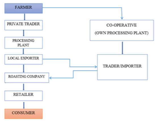 Consider, first, high-yield nations like Uganda, Burundi, Ethiopia, and Rwanda still rely on middle-men and brokers to move their beans to market despite efforts to streamline this process (see diagram below, right-hand column) and, in so doing, remove those most likely to skim profits back down the chain from consumer to farmer.