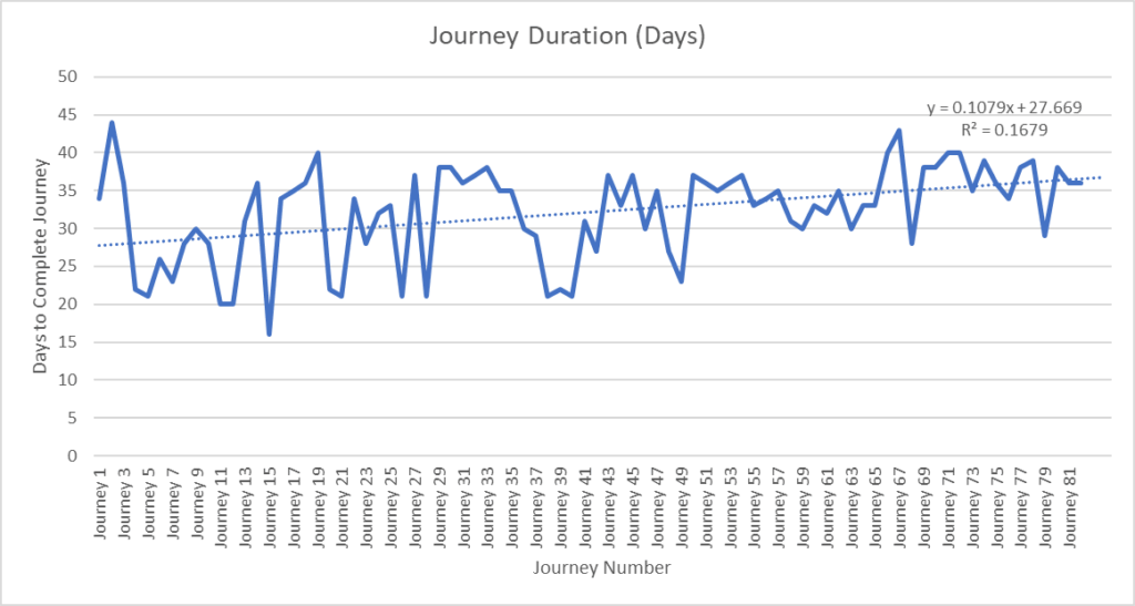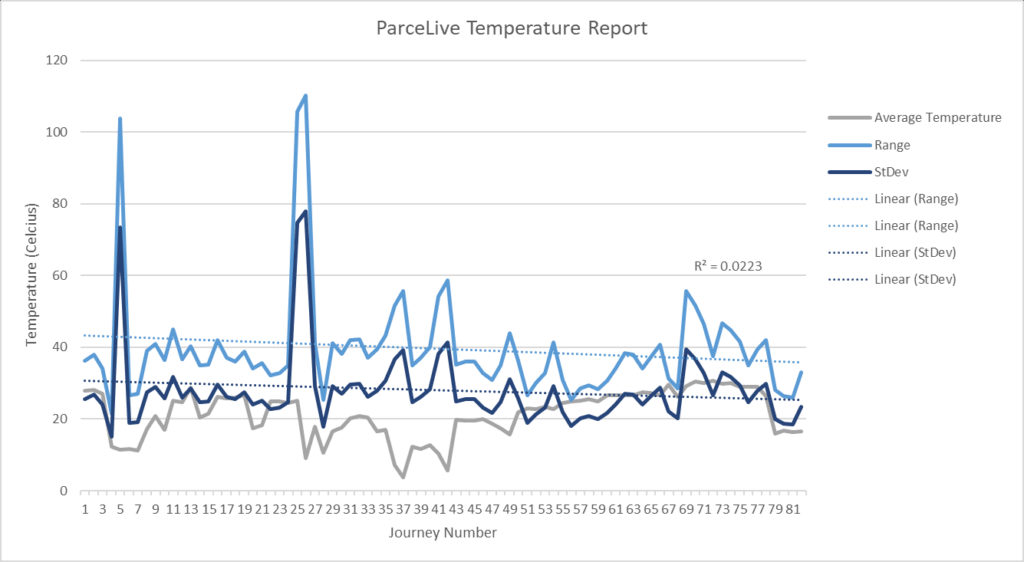What’s more, and going beyond merely reviewing this one set of trips, Hanhaa was able to look at the causative factor, or the R-squared value, across the entire sample and confirm a hopeful upward trend, or glideslope, around trip duration decreasing with fewer and fewer shocks incurred by the cargo, deviations around temperature range, and variations in humidity.
