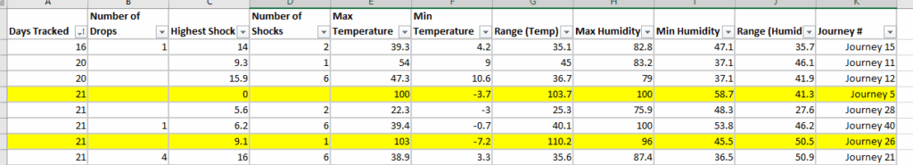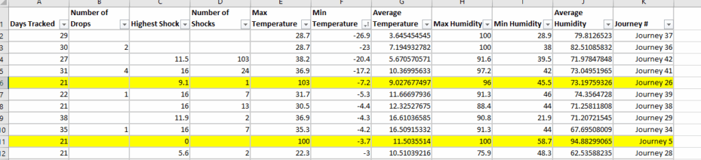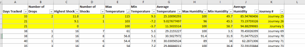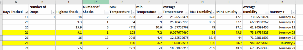 Upon confirmation of these three freight trains moving more rapidly than the other 77 trips, Hanhaa was able to highlight to the MNC that shocks occurred more frequently, which put the luxury goods at a greater risk of damage (seen in column D, below).